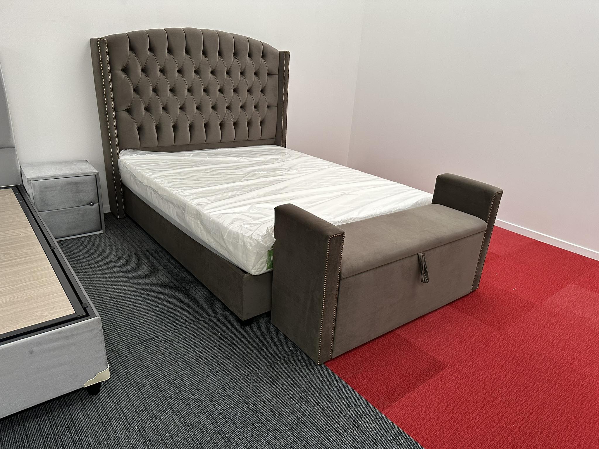 Lit boxspring capitonnée + box de rangement